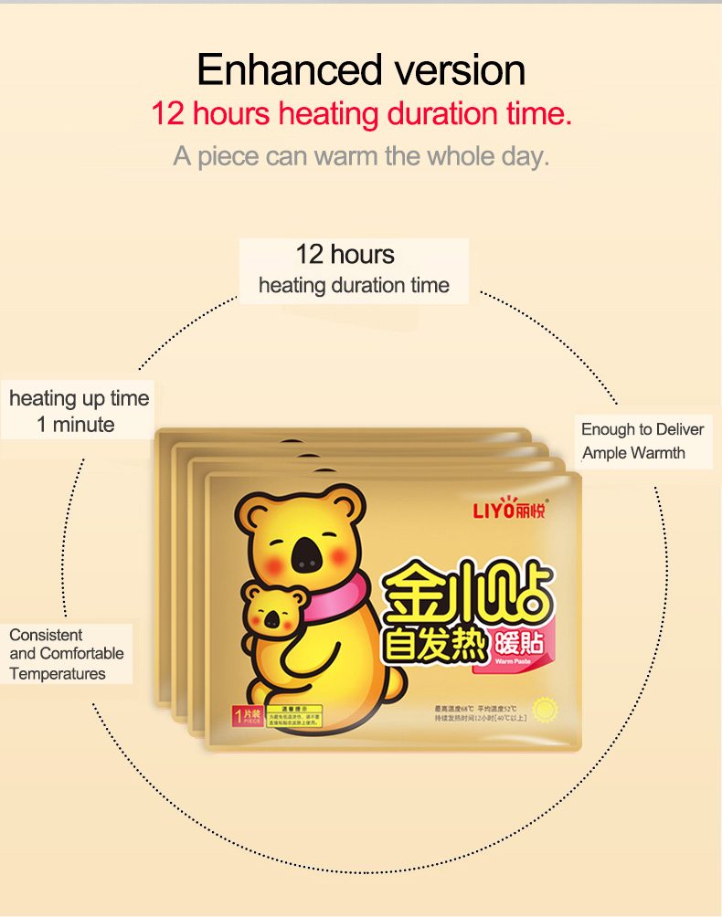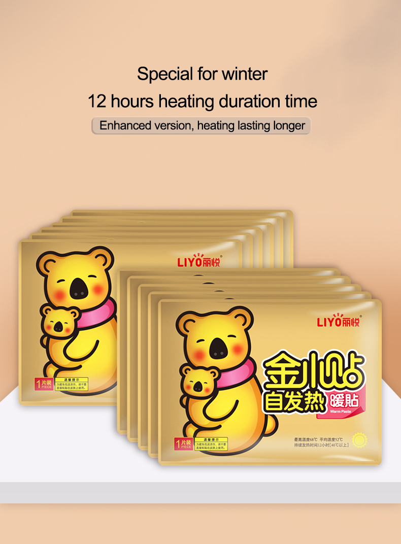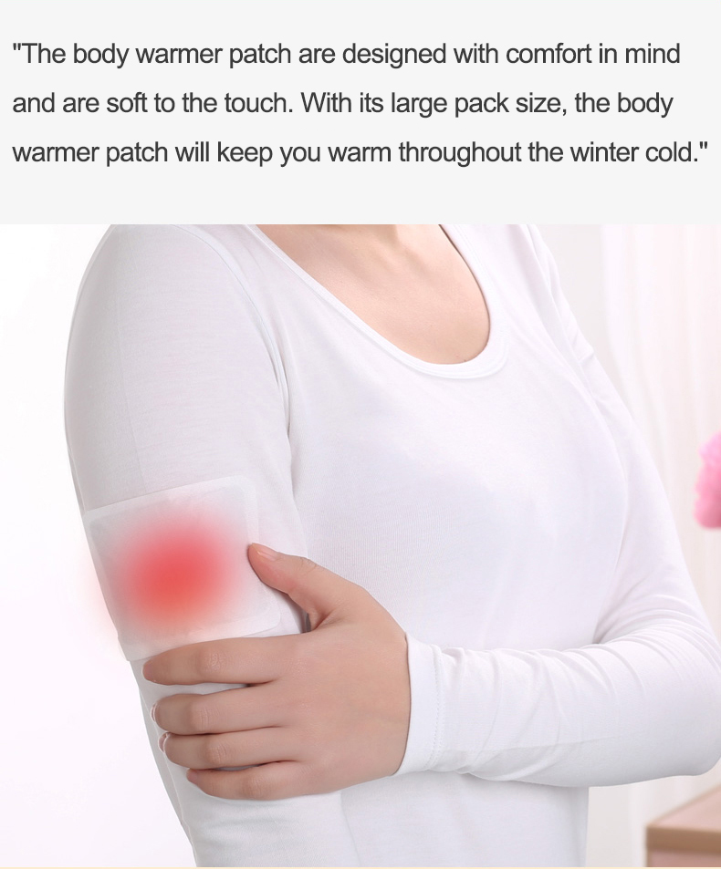 Adhesive warmers Peel and Stick are disposable self-heating air-activated body warmers with iron powder as the main raw material, which undergoes an oxidation reaction with air to continuously release heat. They are used to keep warmer in winter. It has adhesive on the back and can be pasted on clothes.