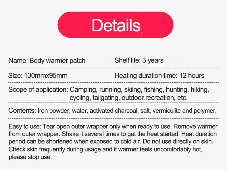 A: Yes, we can customize peel-and-stick body warmers according to your needs. If you don't know the details, you can send the sample to us. We can test your sample, and custom air-active body warmers according to your sample.